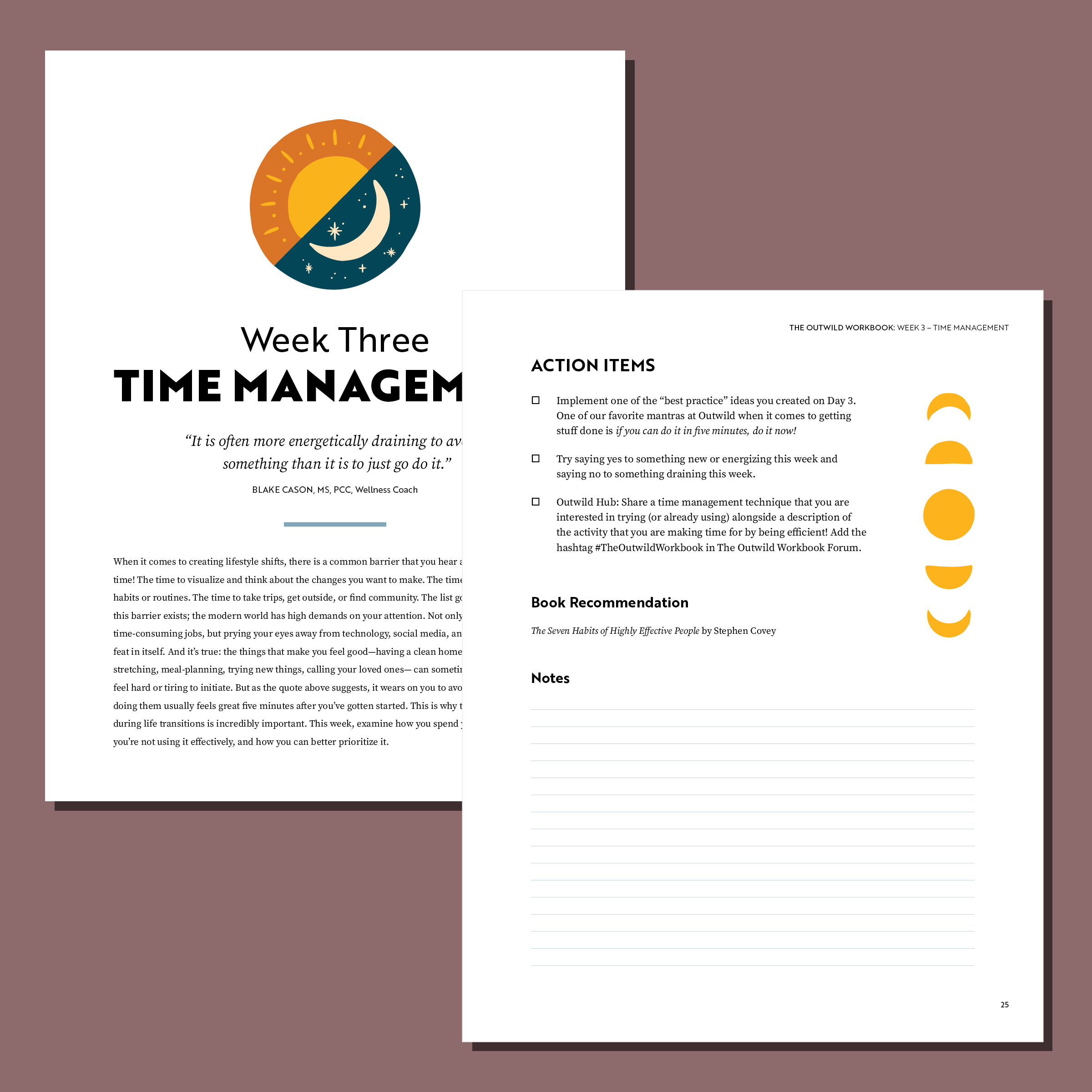 The Outwild Team approached me to help design a workbook filled with four weeks of guided journaling, quotes, action items, resources, and more. They wanted the design to be inspiring, fun, simple, and outdoorsy. The result is a cheerful and colorfully illustrated 36-page workbook. The illustrations on the cover are inspired by the topics within and represent the four focus areas: people, mindset, time management, and goals. Variations of these themes appear throughout the book.